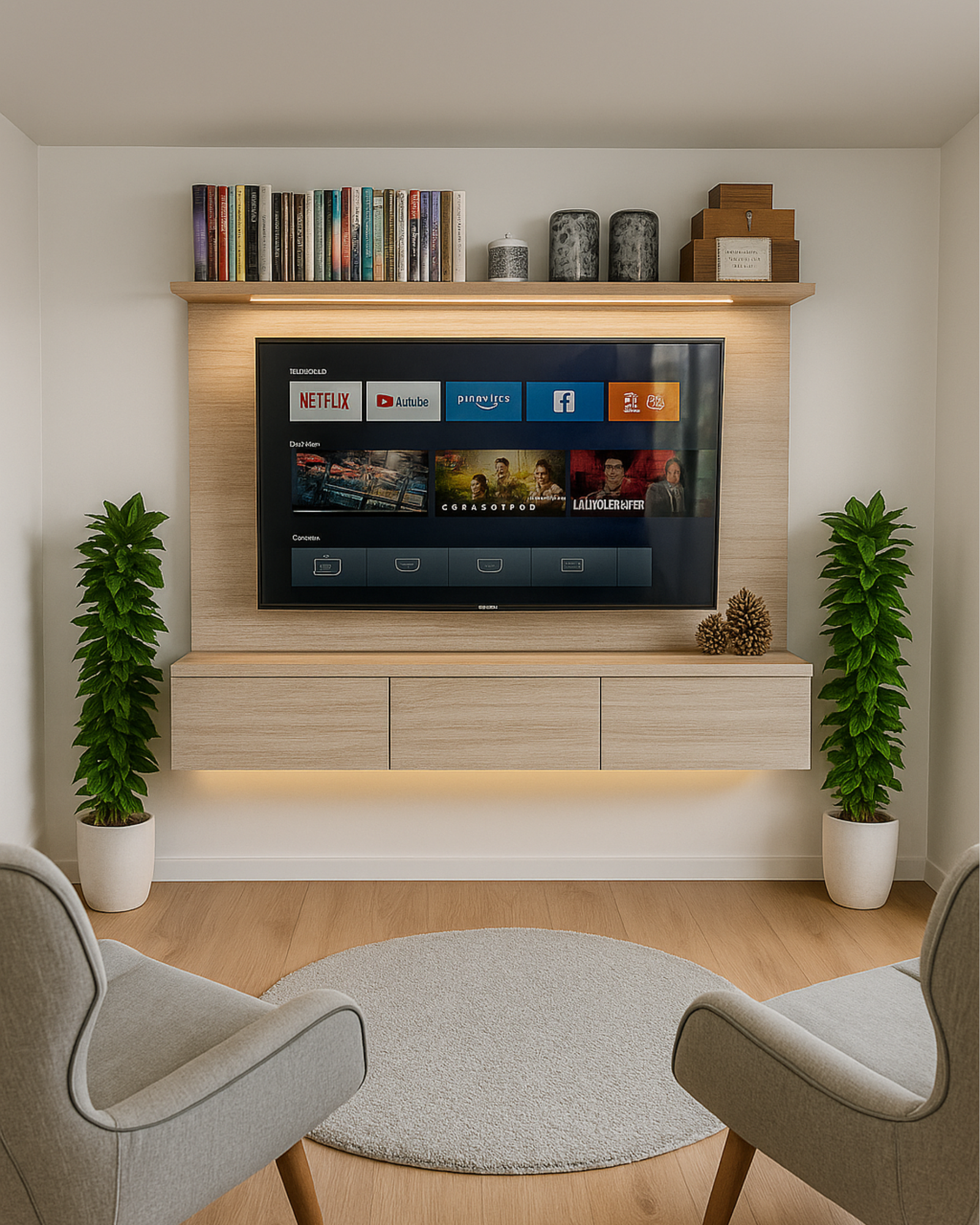 Con dimensiones de 2.00 m de ancho por 2.30 m de alto, está diseñado para soportar televisores de hasta 65 pulgadas. Incluye un panel central en acabado aglomerado amaderado que brinda calidez visual, repisa superior para libros o elementos decorativos, y un módulo flotante de tres compartimentos que libera espacio en el suelo y facilita la limpieza.
