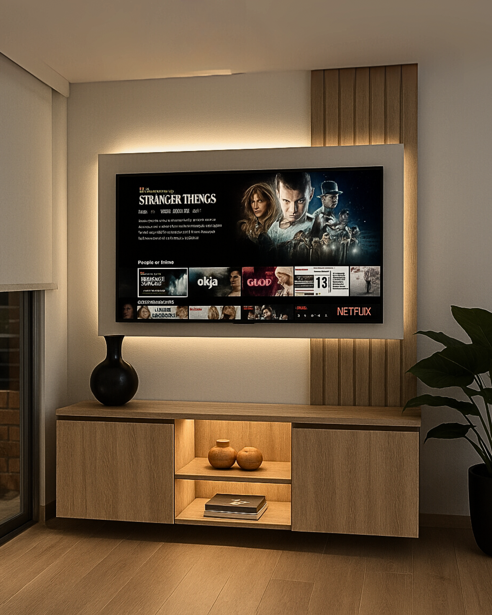 Sus medidas son 1.50 m de ancho por 2.30 m de alto y es compatible con televisores de hasta 55 pulgadas. Incluye mueble inferior con puertas laterales para almacenamiento y nicho central iluminado para decoración o libros.