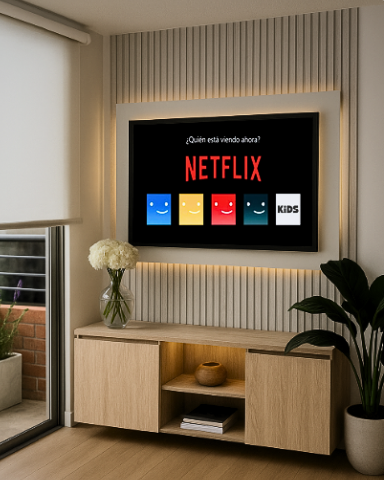 Sus dimensiones de 1.50 m de ancho por 2.30 m de alto lo hacen perfecto para aprovechar espacios verticales, y su estructura es compatible con televisores de hasta 55 pulgadas.