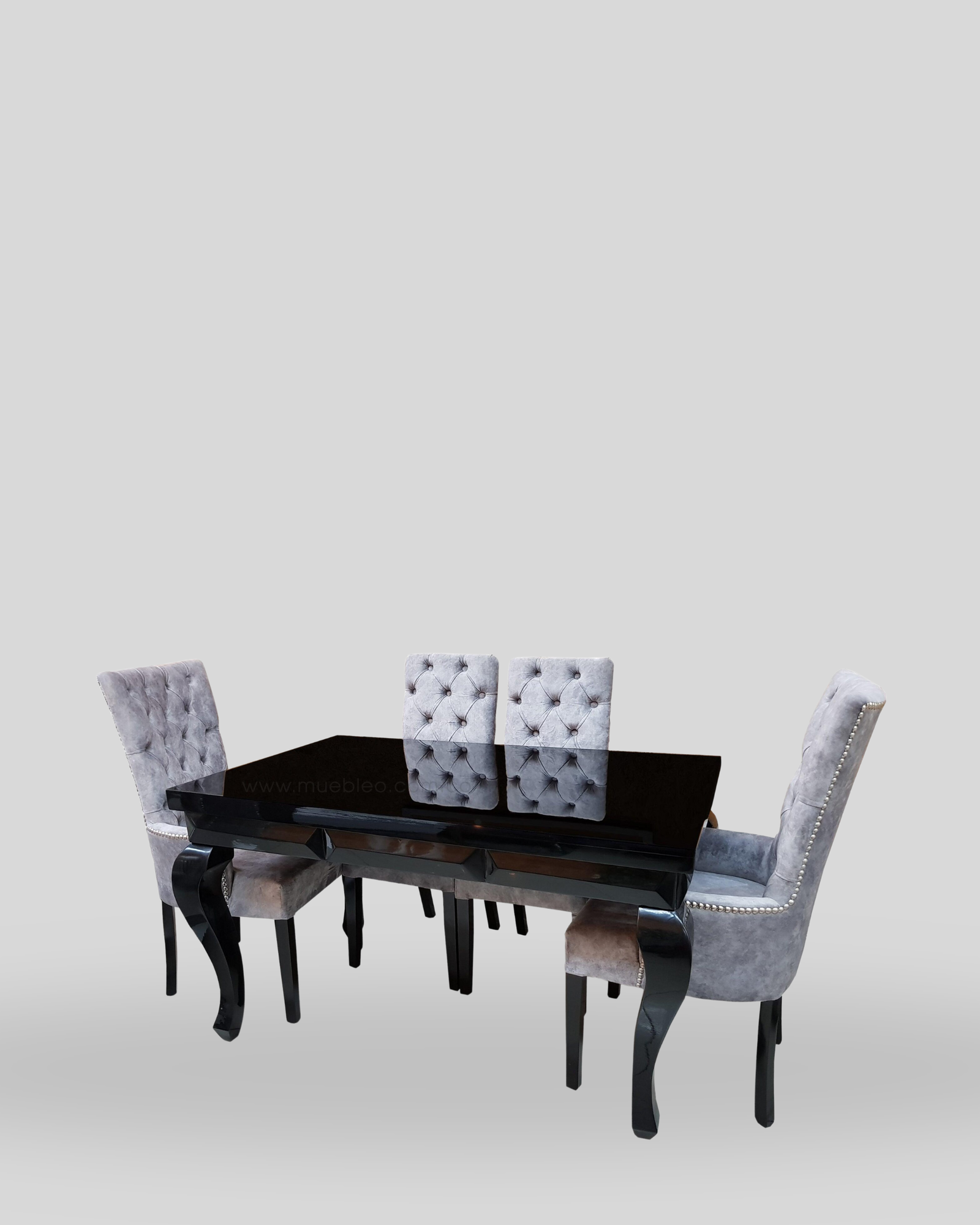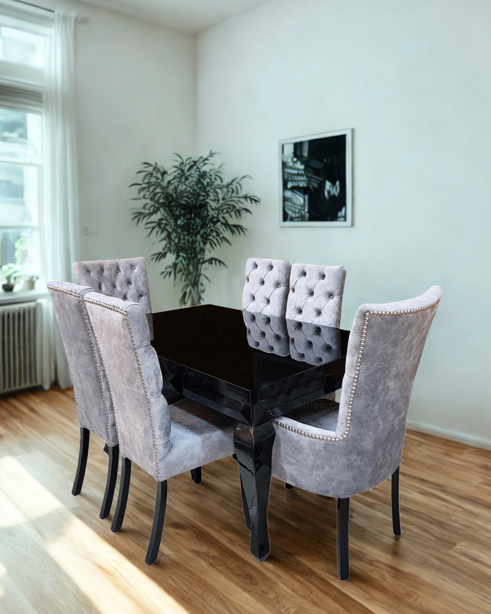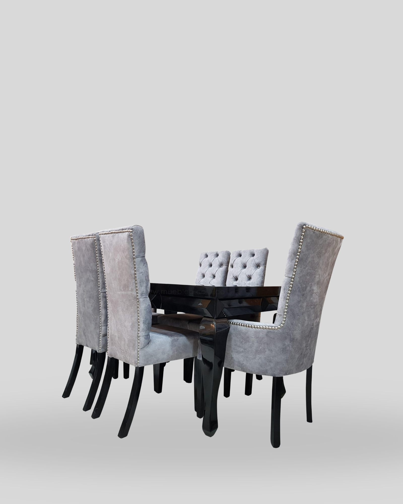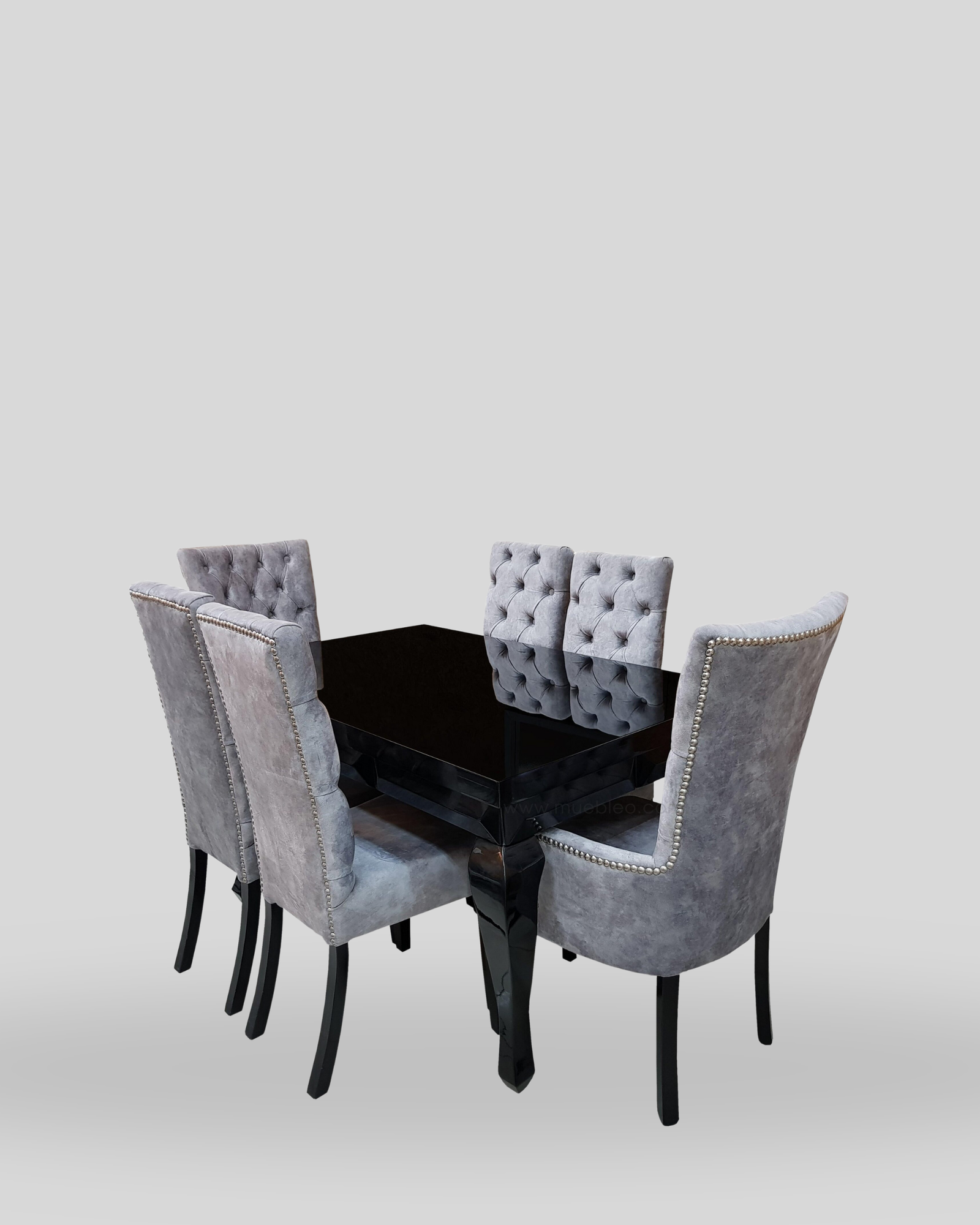 Comedor con acabado tipo espejo con pintura de alta gama, sillas capitoneadas con puntos y detalles en botones metálicos.