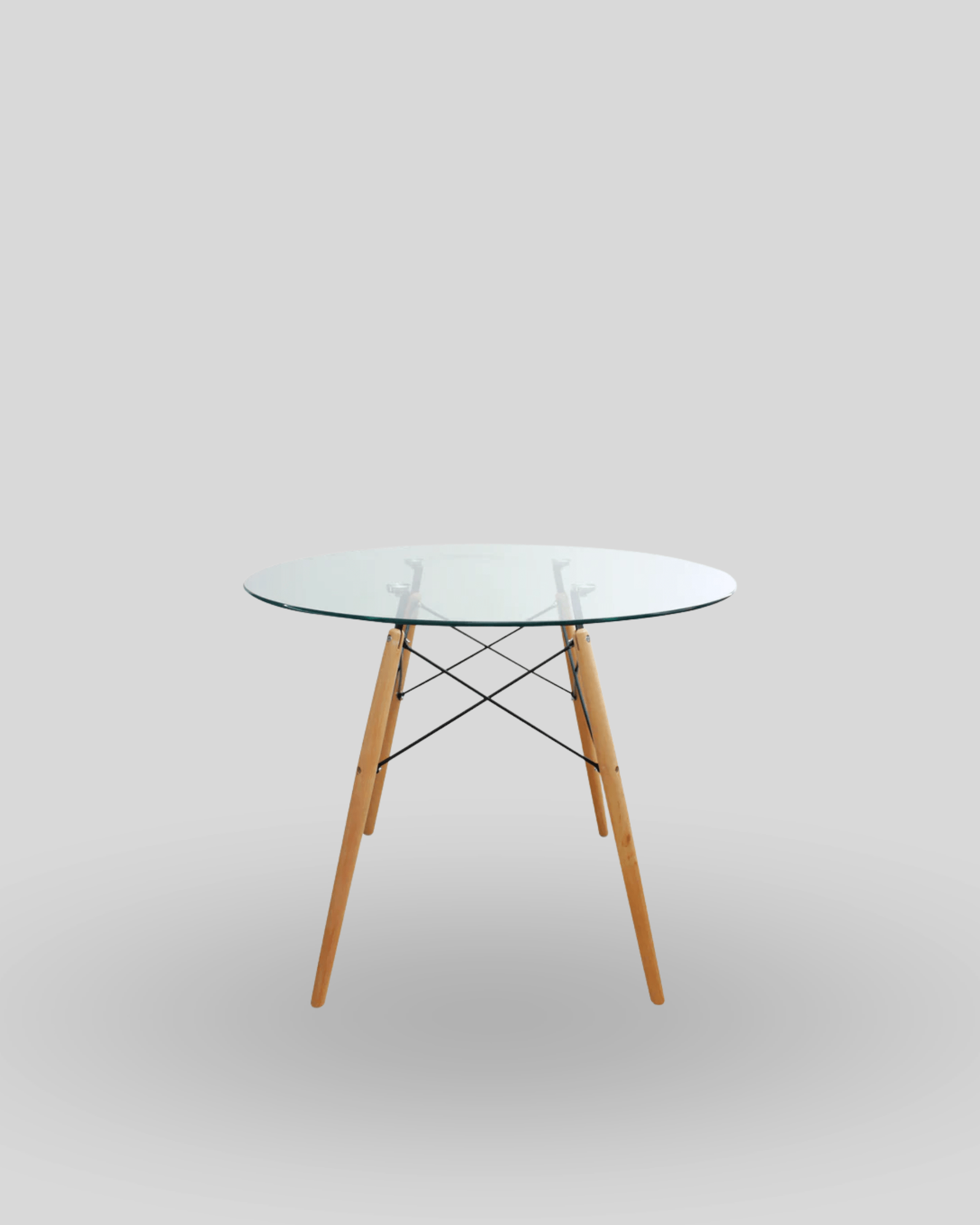 Mesa redonda modelo Vitraris, diseñadas con tapa de madera o cristal y base de madera con alambres de acero al carbono, pintados y entrelazados.