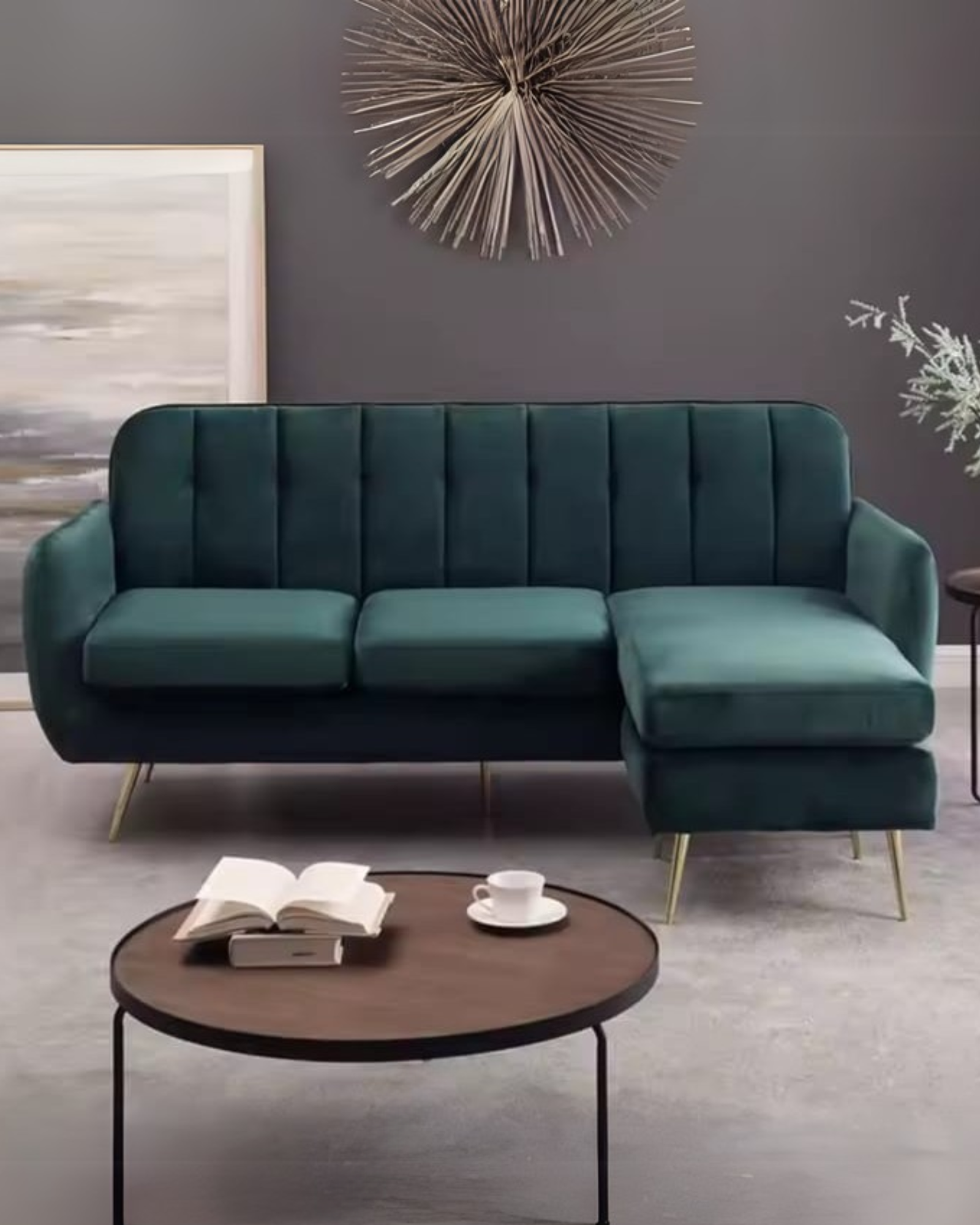 Elegancia y confort se combinan en este sofá esquinero tapizado en suave tela antifluido. Su diseño moderno con patas doradas aporta un toque de sofisticación, mientras que su estructura resistente y cojines acolchados garantizan comodidad y durabilidad.