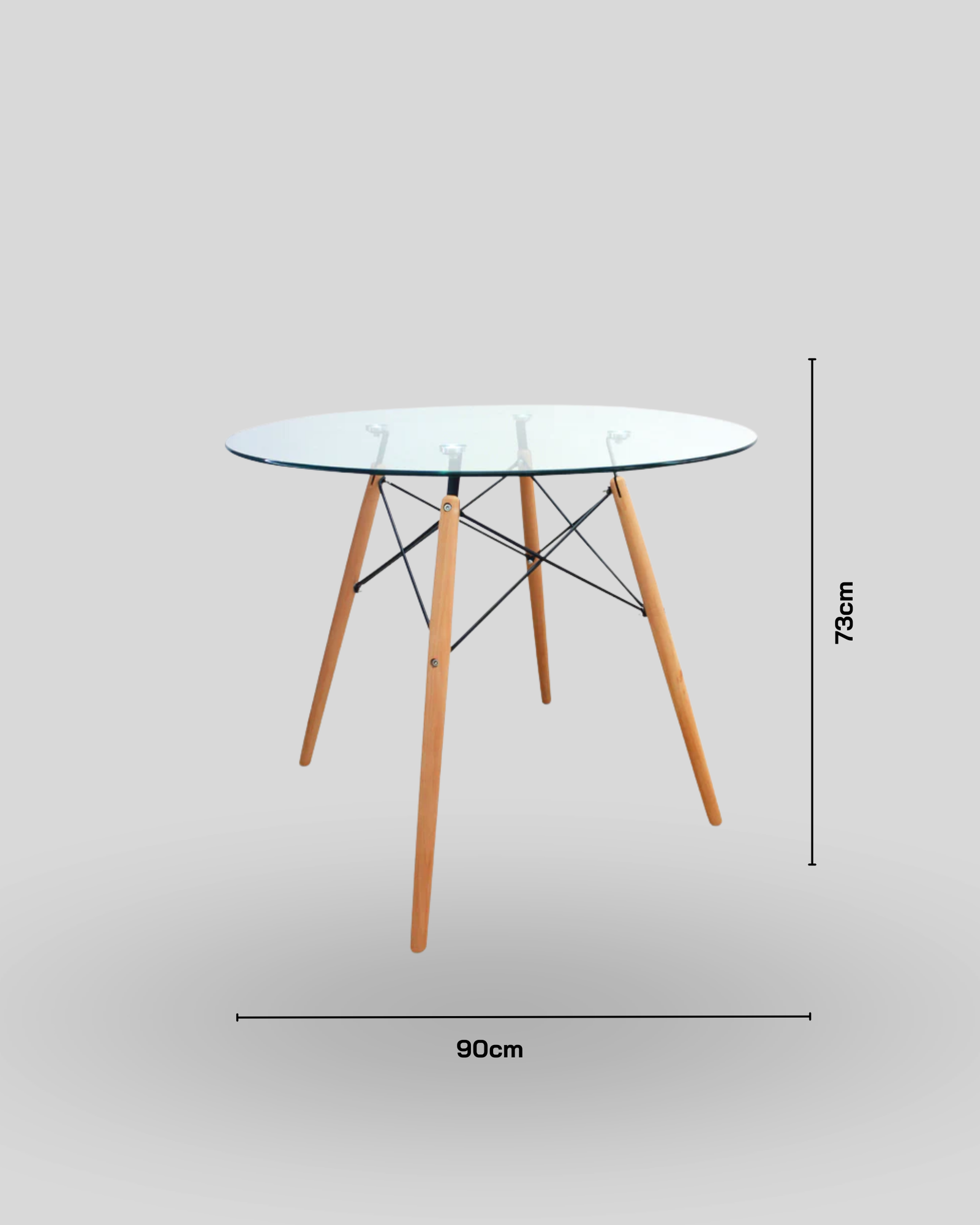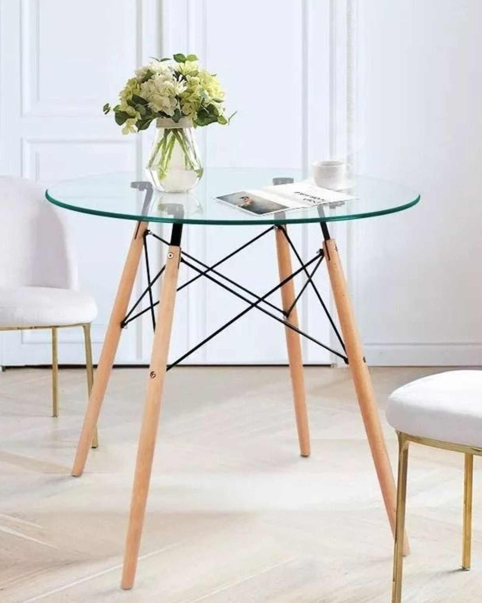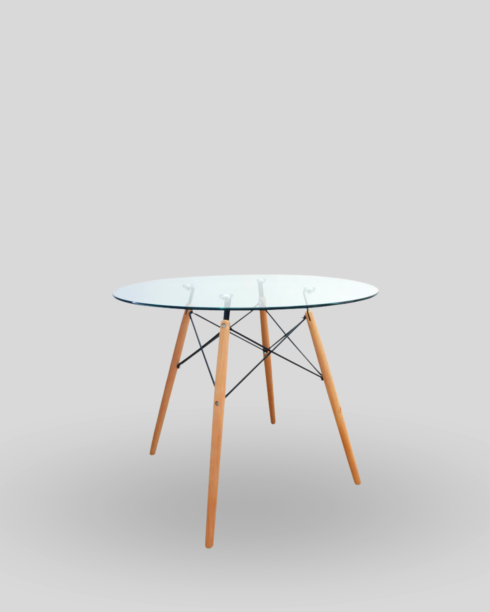 Mesa redonda modelo Vitraris, diseñada con tapa de madera o cristal y base de madera con alambres de acero al carbono, pintados y entrelazados.