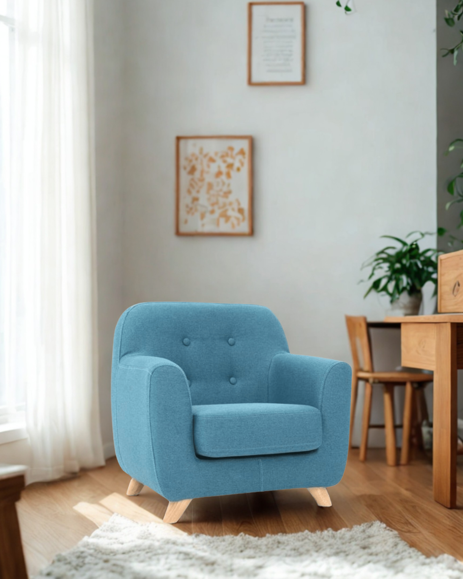Silla fabricada en pino inmunizado, patas en roble macizo, espumas de alta densidad para mayor resistencia y suavidad al sentar, tapizado con botones que le brindan un toque de elegancia y modernidad.