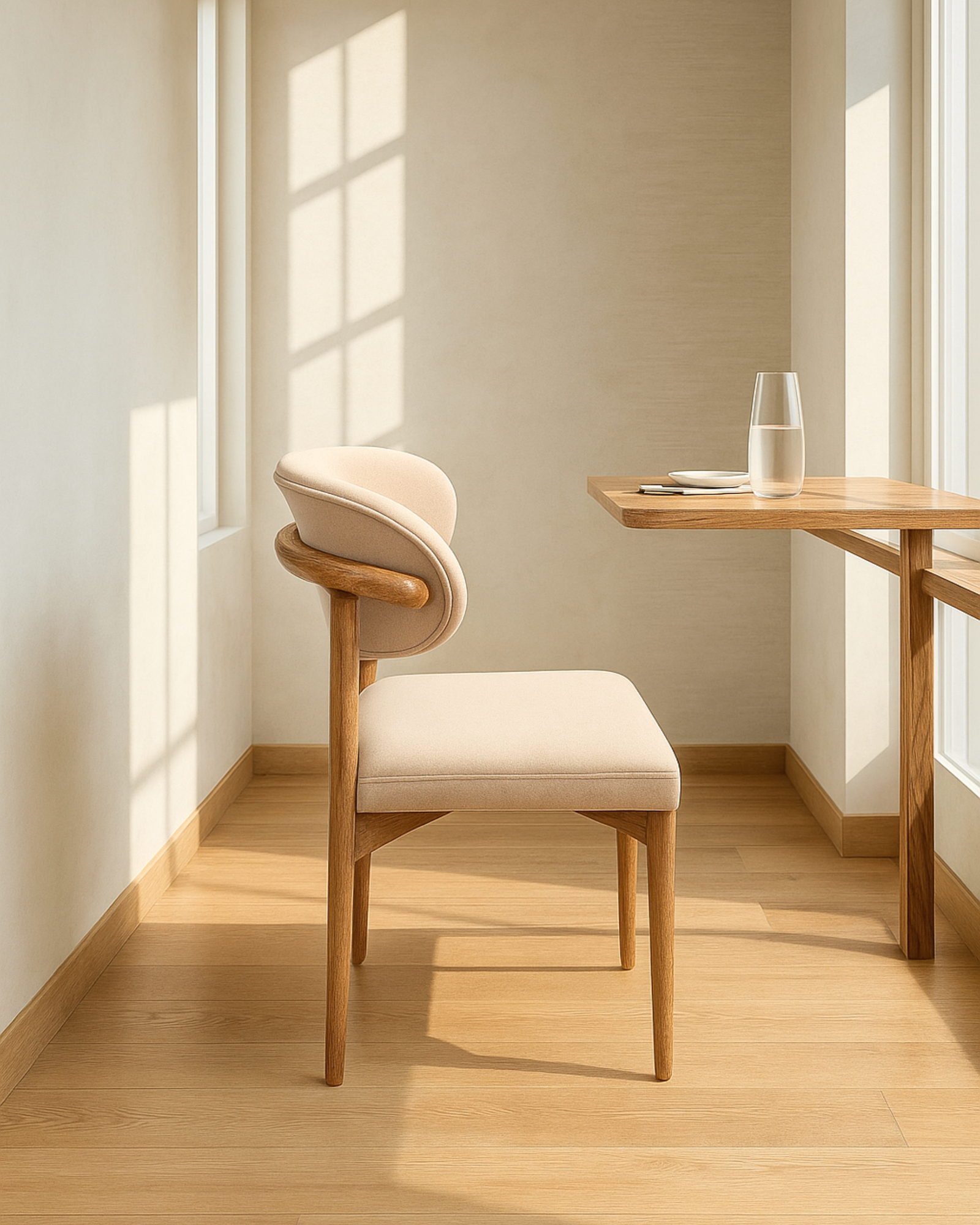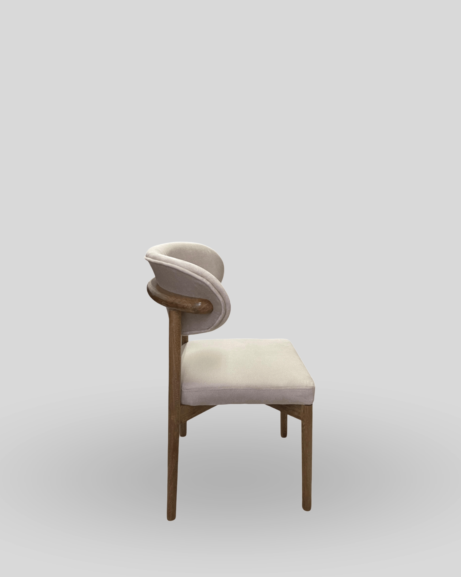 La estructura de la silla está hecha de madera de roble, un material robusto y de alta calidad, que aporta calidez y un estilo natural a la pieza. El diseño de las patas de roble puede presentar acabados en tonos claros o medios, resaltando las vetas naturales de la madera.