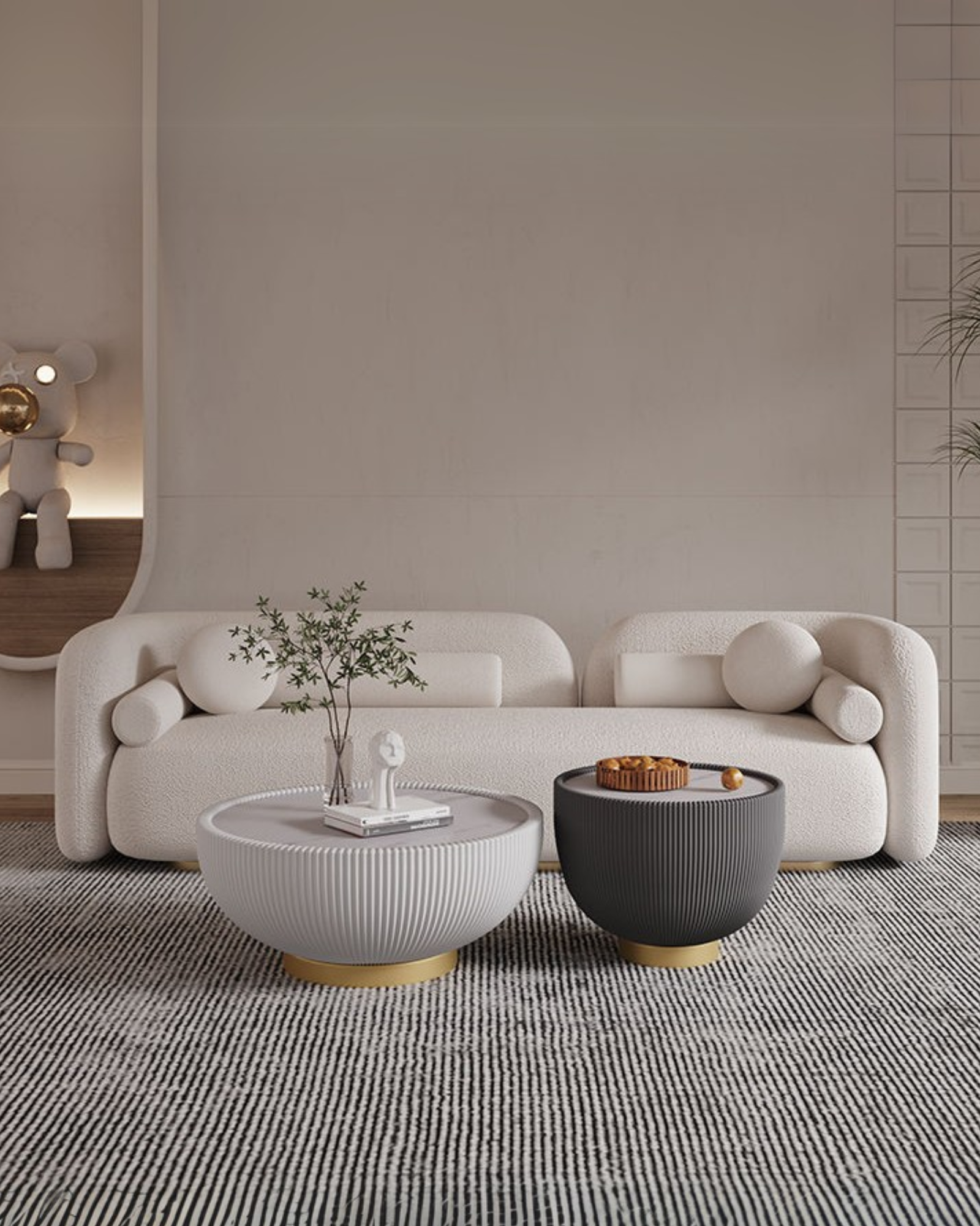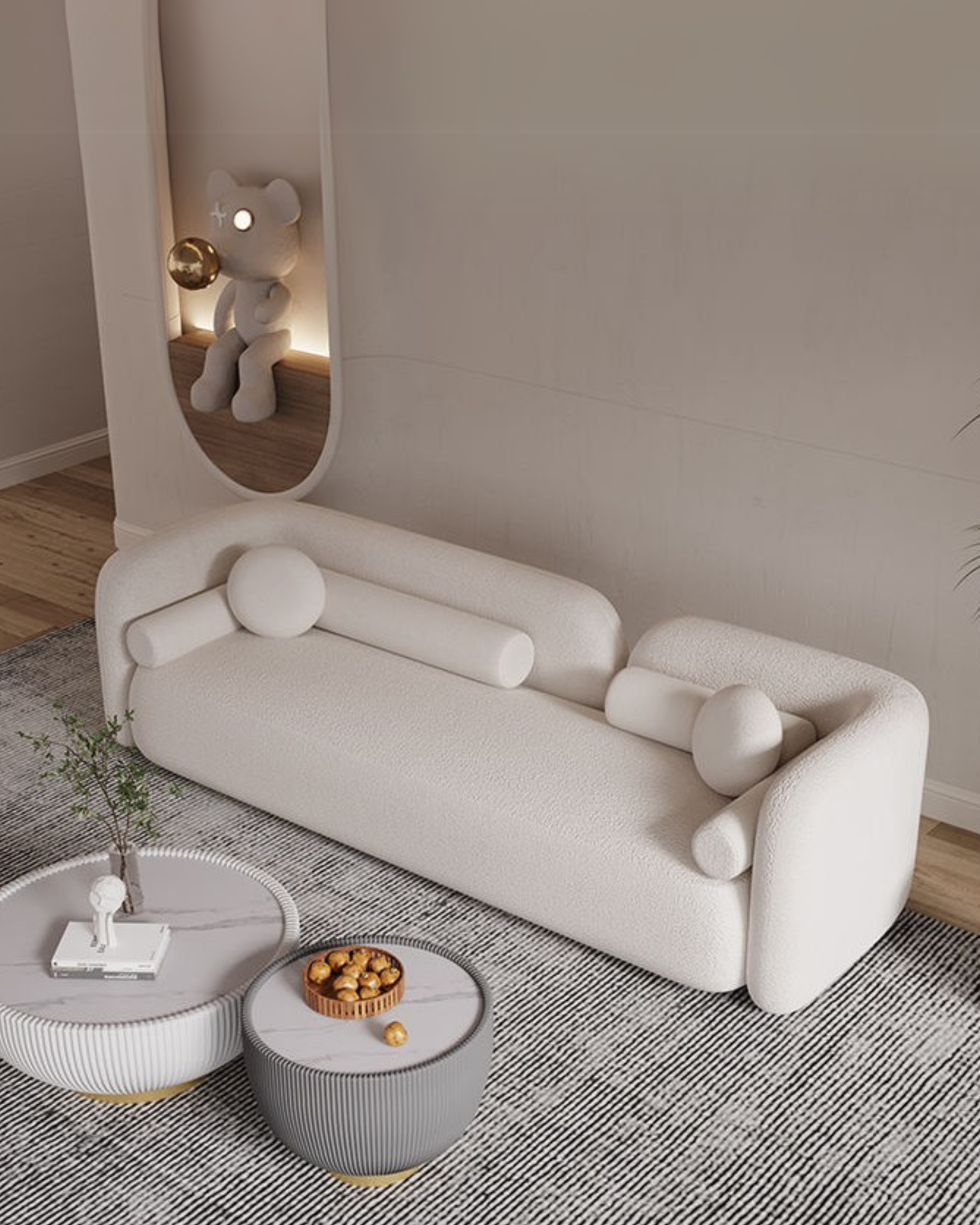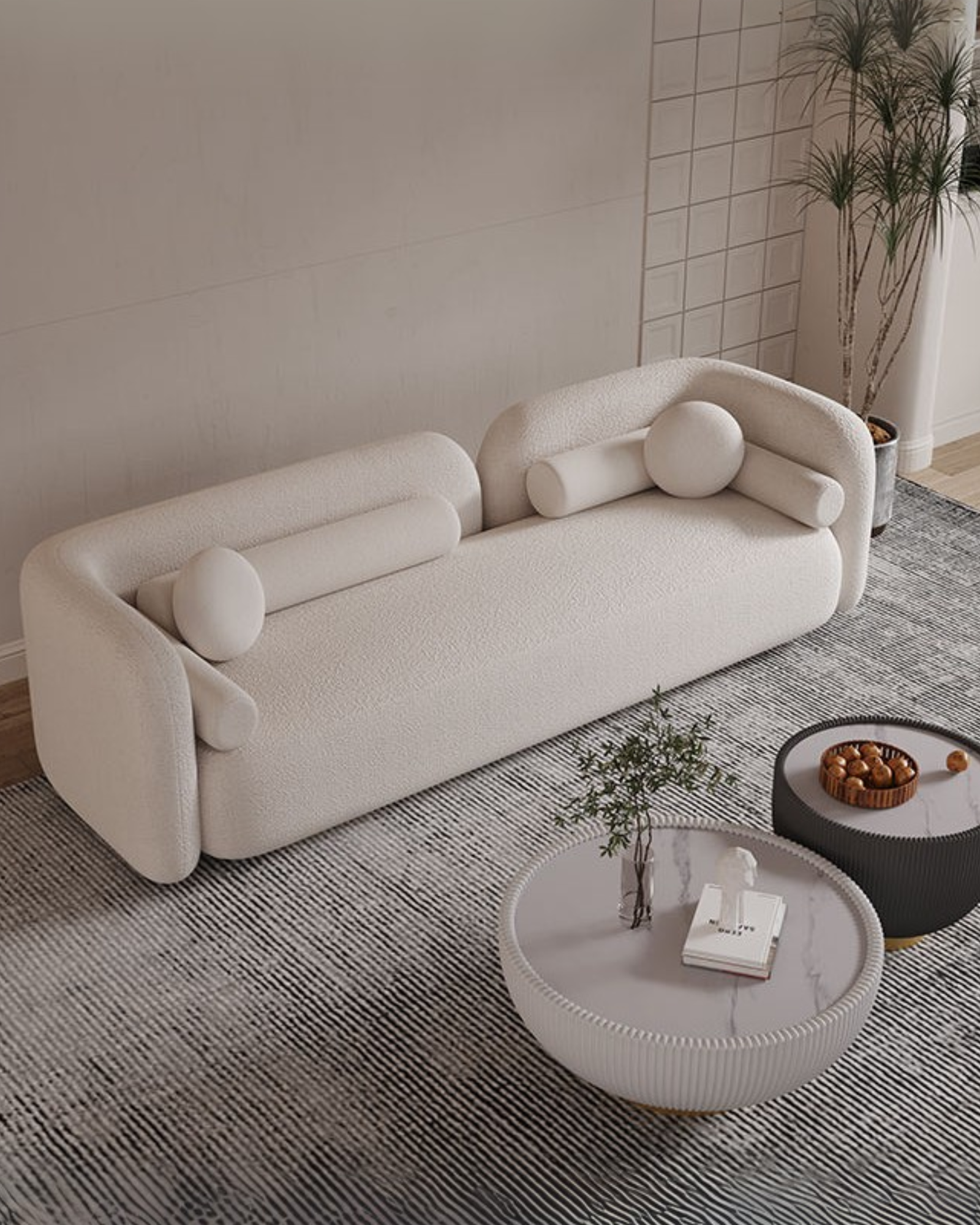 Descubre la elegancia y comodidad del sofá Polar, una pieza icónica de diseño moderno con formas curvas y minimalistas. Su tapizado en tela antifluido aporta suavidad y calidez, mientras que sus cojines cilíndricos añaden un toque vanguardista.